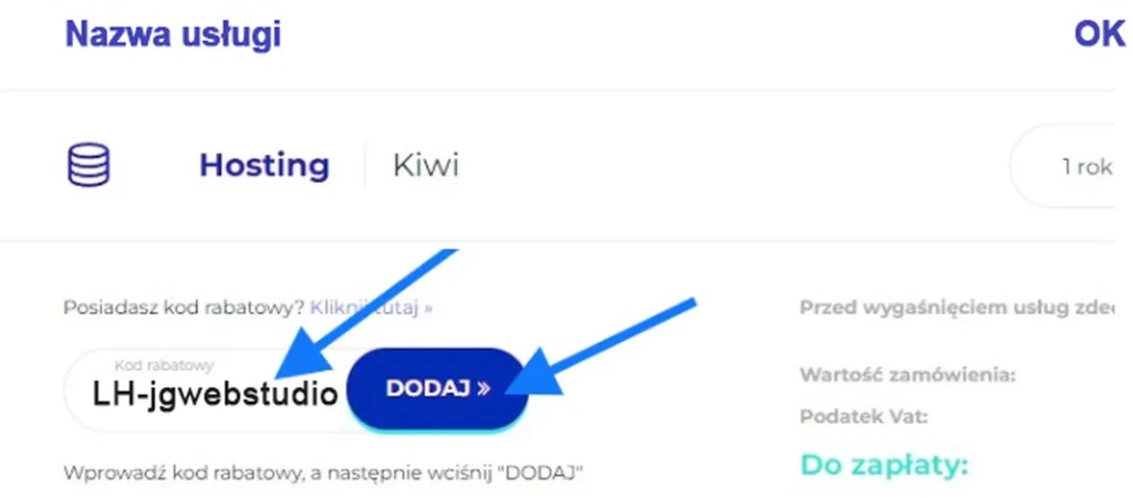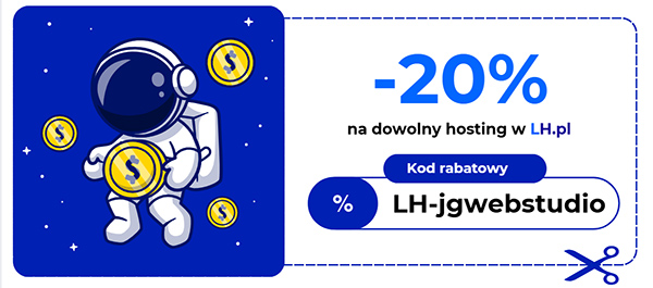 Zniżkę na hosting możesz również uzyskać na LH.pl bez zamawiania strony. Możesz skorzystać z mojego kodu rabatowego -20% wpisując w pole kodu: LH-jgwebstudio (wielkość znaków nie ma znaczenia).